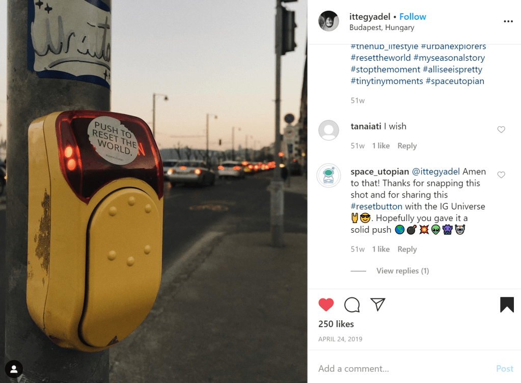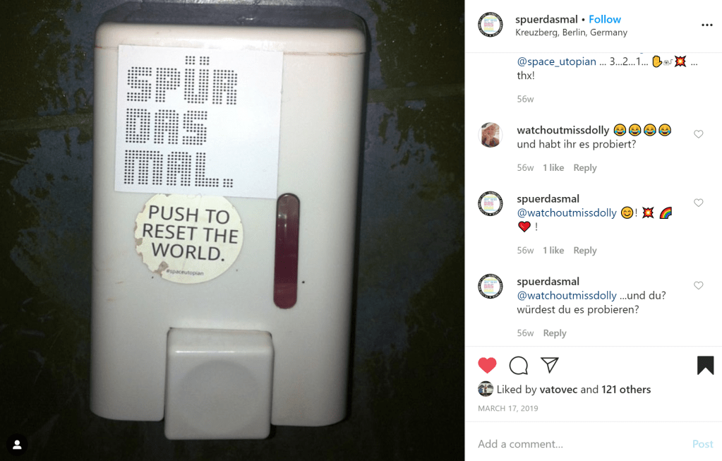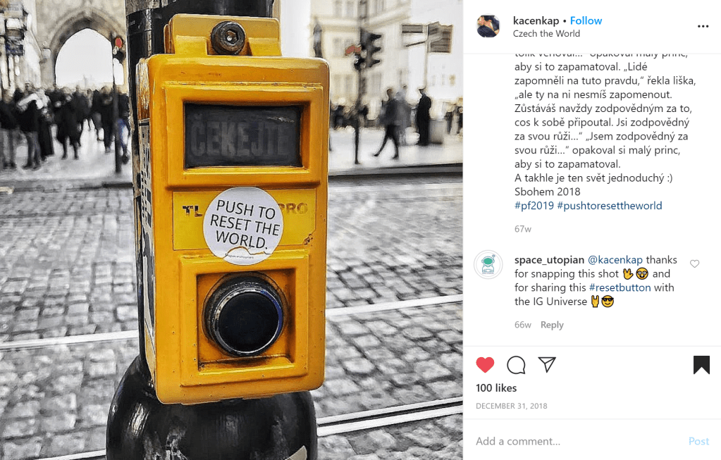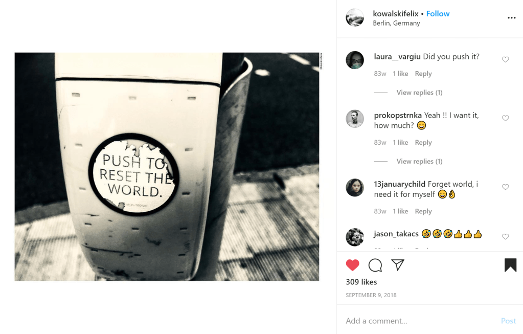 Distracting people’s autopilot, with a small and subtly placed sticker. Engaging their souls long enough, briefly pulling them out of their comfort zone, is the objective. Thus, creating a tiny glitch in the matrix of their daily lives. With the help of this humble street-art, everyday actions, such as pushing a button or posting a letter, are being transformed into an amusing call for action.