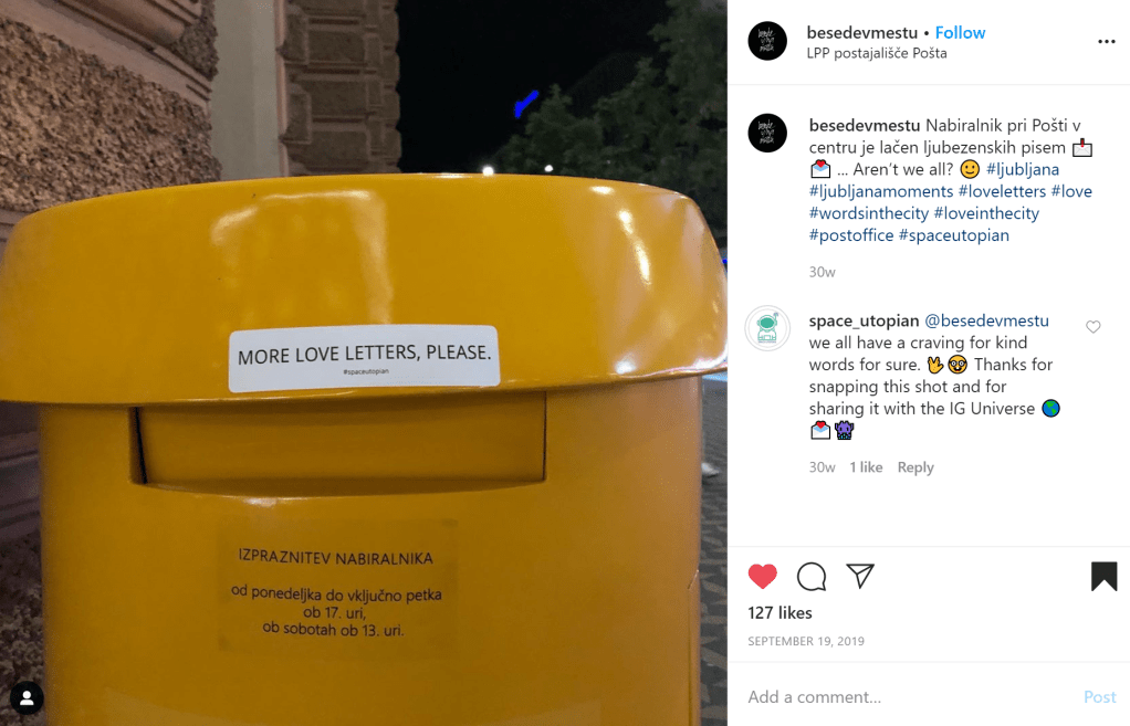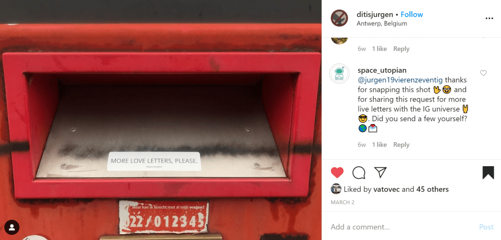 Slowly, but surely, Space Utopian is becoming a collective of idealistic, defiant yet empathetic souls. This project is no longer a ‘one-(wo)man’ show. It has transformed into a global group effort. The stickers are for sale now, and you can help as well with strategically placing the slap-tags in your hometown or wherever you may roam. Just know that the Space Utopian movement always respects people’s private property and cultural heritage.